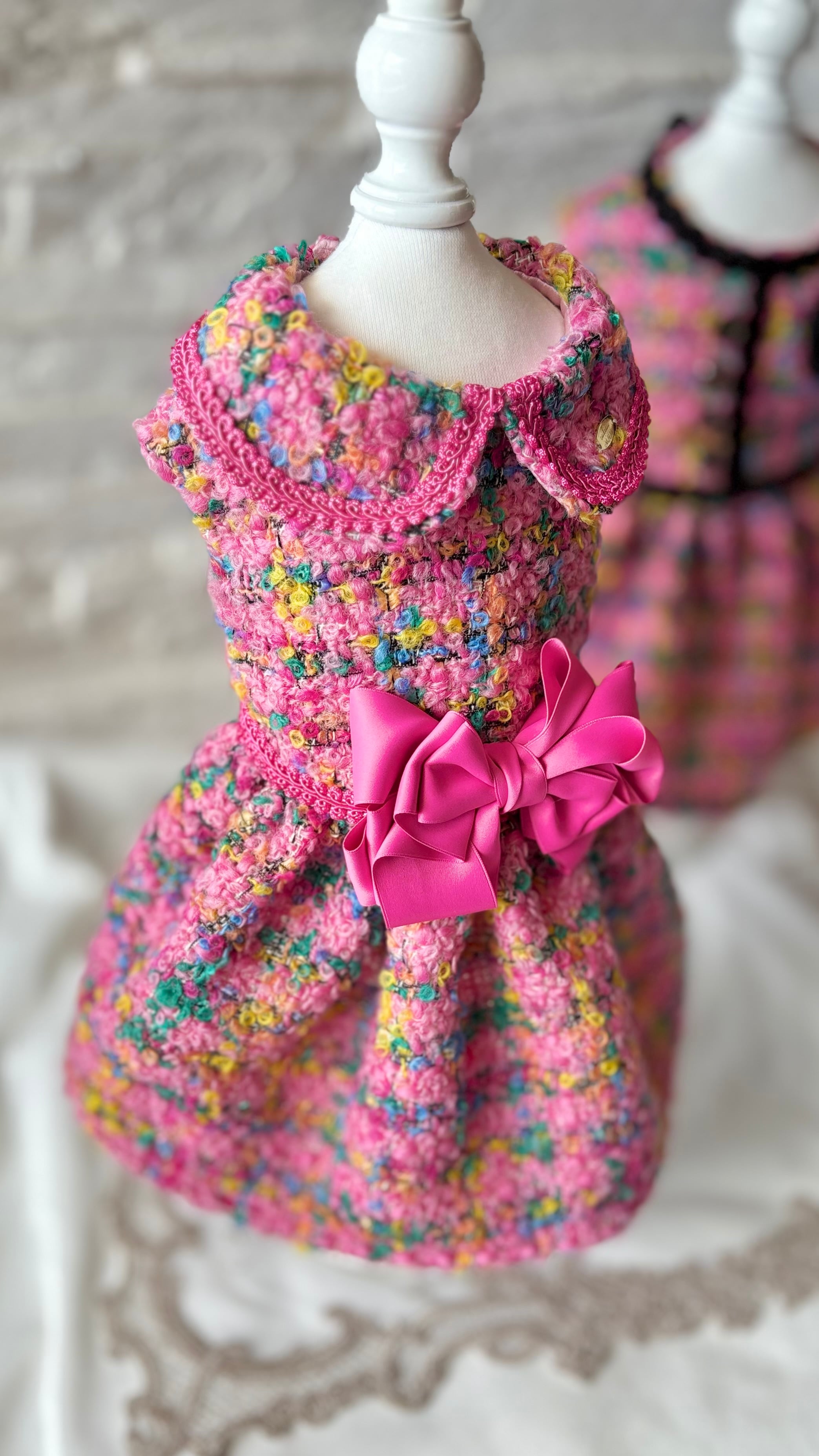 発色の良い鮮やかなピンクに、カラフルな糸が織り込まれた上質な生地です