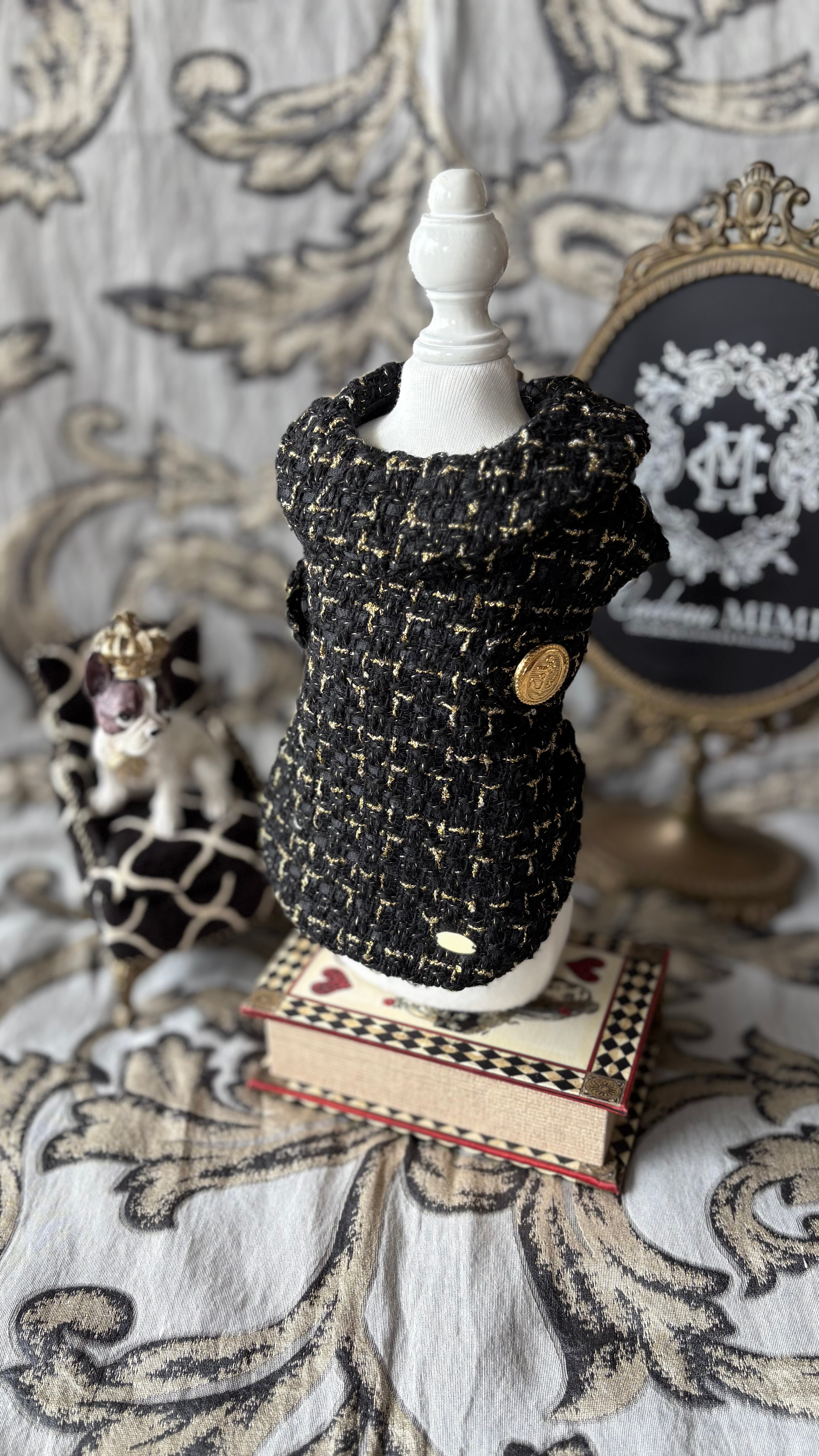 質の事なる黒糸/黒リボン×金糸のツイードコート